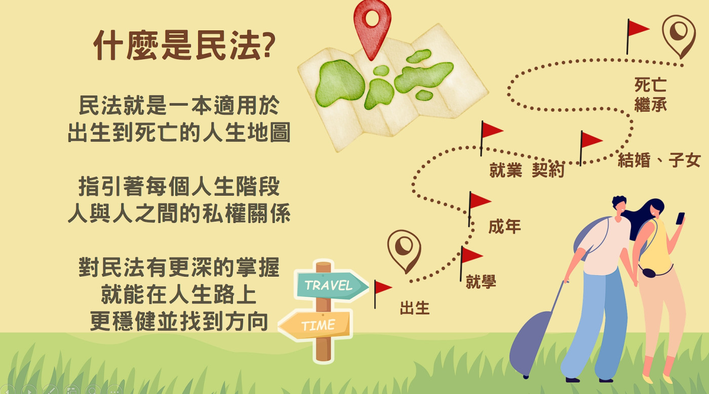 本次講座以 「民法與人生的探索旅程」 為主題,跳脫傳統條文式的法律教學方式,改以生活化、情境式的案例切入,帶領學生理解法律並非遙不可及的專業語言,而是與每個人一生密切相關的生活工具。從家庭關係、校園互動、金錢往來,到未來進入社會後可能面臨的契約、責任與風險,民法其實早已默默參與我們每一個人生階段的選擇。