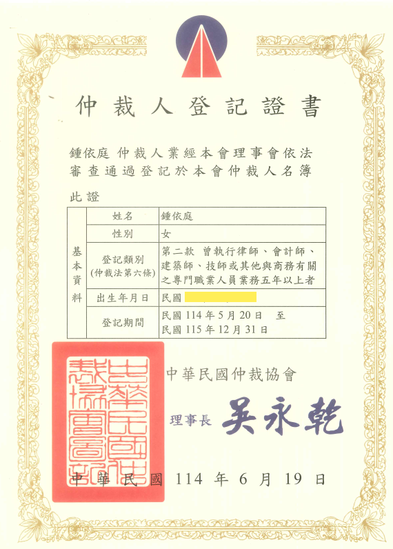 鍾依庭律師取得中華民國仲裁協會之仲裁人資格,未來能為客戶提供更多元的紛爭解決管道。
